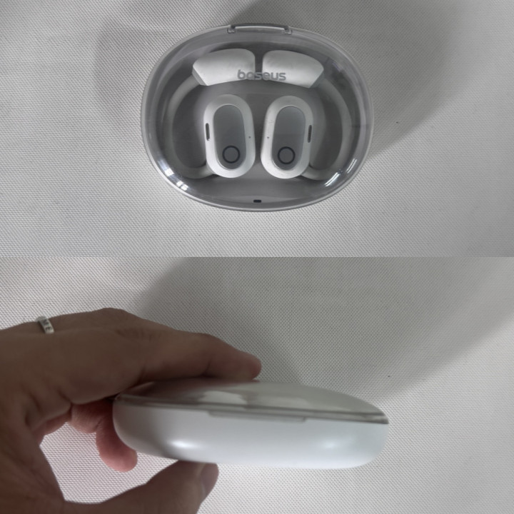 虹觅Ultra:白色配色很检朴,外壳是磨砂材质,手感很可以。耳机举座是扁平的筹办,放到口袋里基本无感,便于佩带。