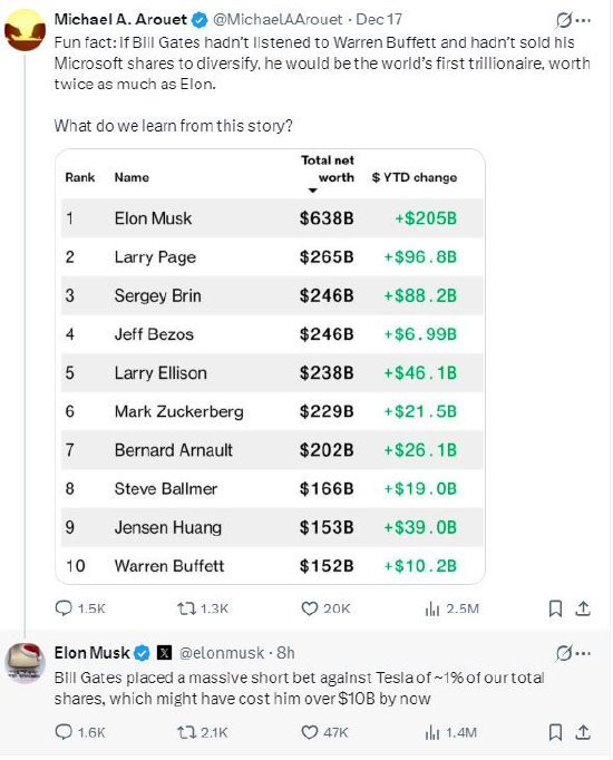 一位网友在X平台上共享最新的寰球富豪名次榜并辩驳称:“若是比尔·盖茨莫得听沃伦·巴菲特的话,莫得出售他所执的微软股票来散播投资,他将是天下上第一个万亿好意思元财主,身价是埃隆的两倍。”